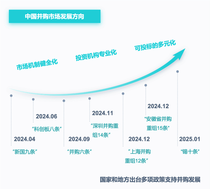 2024年国家和地方相继出台系列并购支持政策,旨在活跃市场并促进经济高质量发展,为并购带来了结构性的发展机遇。在政策的推动下,我国并购市场的制度建设日益完善。同时,参与并购的机构数量显著增加、策略逐渐多元、专业能力也有所提升。此外,随着更多行业进入成熟整合阶段,并购标的不再局限于传统制造行业,而是呈现出多元化发展的特征,越来越多的中企也将通过跨境并购进入国际市场。