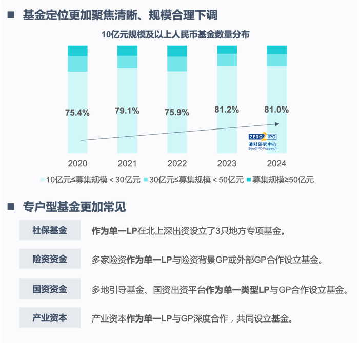 当下,不同背景LP的出资诉求明确且分化,投资机构在募资时需要花费大量精力来平衡各方诉求,未来投资也存在不确定性。对此,部分机构放缓大规模综合性基金的设立节奏,转而设立若干专户型基金,以更好地服务单一LP或具有相同诉求的某一类LP。专户型基金化整为零,明确的投资策略、合理的基金规模能够有效减轻机构的投资压力,预期未来数量将稳定增长。