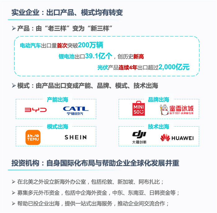 近年来,我国在国际贸易中已由初级制造业的提供者转变为先进制造业和服务业的提供者,不但产品出口结构发生调整,企业出海模式也逐步变化,从产品出口变成产能、品牌、模式、技术出海。与此同时,投资机构也在积极探索出海新模式,通过设立新的海外办公室、募集多元外币资金、提升赋能水平等方式,在完善自身国际化布局的同时为中国企业的全球化发展提供支持。