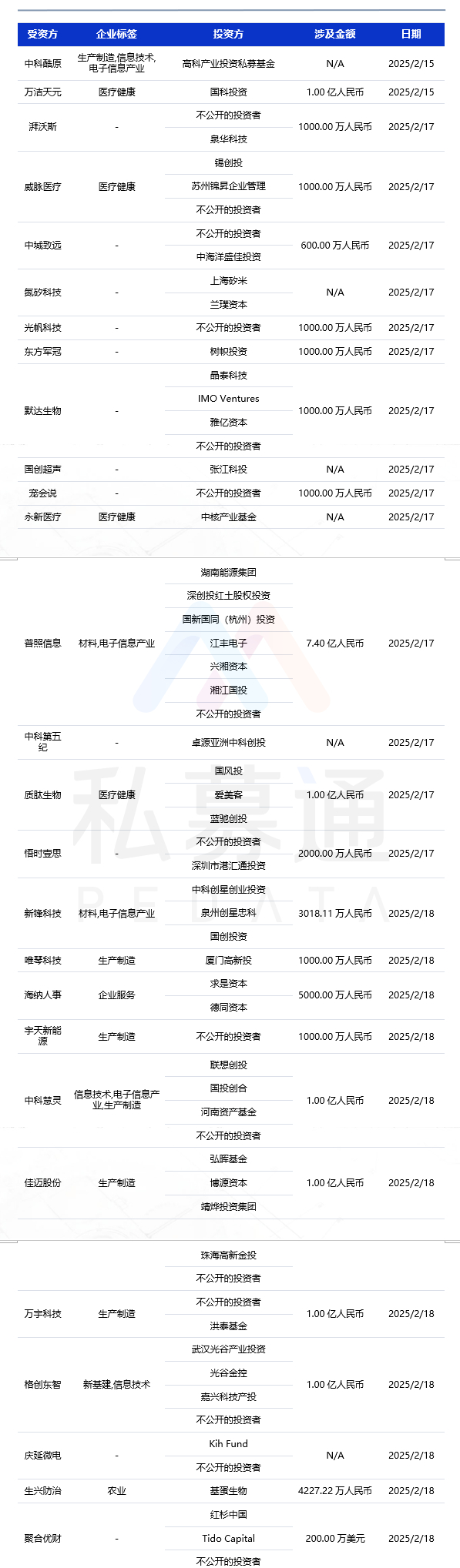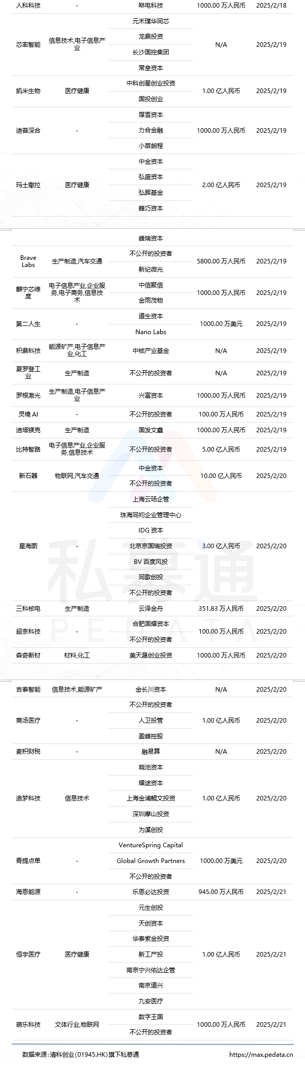 清科创业(01945.HK)旗下私募通统计:截至本周五下午,共发生54起投资事件,其中披露投资金额事件43起,共计42.67亿人民币。本周涉及金额较大的投资事件是:2025年2月20日,中金资本运营有限公司、不公开的投资者投资新石器慧通(北京)科技有限公司10.00亿人民币。新石器是一家L4级无人驾驶商用车厂商,致力于用无人车重构智慧城市物流基础设施,凭借十余年打造物流行业智能硬件经验,融合车规级产品化能力,率先以L4级无人车为载体,借车联网之力,拥有L4级无人车产品商业化落地和规模化交付能力。(2025年2月15日-2025年2月21日)