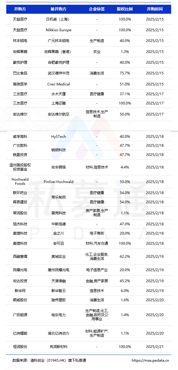 清科创业(01945.HK)旗下私募通统计:截至本周五下午,本周并购市场共发生27起并购事件,披露的交易金额为33.63亿人民币。本周涉及金额较大的并购事件是:2025年2月20日,惠州亿纬锂能股份有限公司成功受让荆门金石十一号企业管理服务合伙企业(有限合伙)、荆门金石十号企业管理服务合伙企业(有限合伙)、荆门金石八号企业管理服务合伙企业(有限合伙)、荆门金石七号企业管理服务合伙企业(有限合伙)、荆门金石六号企业管理服务合伙企业(有限合伙)等持有的湖北亿纬动力有限公司的1.1%的股权,作价5.79亿人民币。亿纬动力是一家动力电池研发商,提供磷酸铁锂动力电池、通信储能电池、动力和储能电池集成系统等系列产品,服务于电动大巴和通信储能领域。拥有电芯研制与系统集成核心技术,可提供从电芯、模组到系统及BMS的全面解决方案。(2025年2月15日-2025年2月21日)