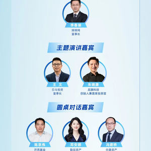 在圆桌对话环节中,将有以下嘉宾参与:开思基金董事长陈京伟;勤辰资产合伙人邓安娜;合晟资产总经理冯建桥;九坤投资市场研究负责人郭泓辰;永安国富固定收益部总经理郭莹;千衍私募合伙人马双杰;泓湖投资合伙人、投资经理汤诗语;凯丰投资总经理王东洋;聚宽投资合伙人王恒鹏;黑翼资产首席策略分析师王俊;博普科技总裁王镭;善择基金创始人兼总裁杨萍;玄元投资权益投资负责人杨夏;盛麒资产首席投资官、创始人曾文凯;利位投资总经理张晟刚;君之健投资创始人兼总经理张勇。(嘉宾顺序无先后,按姓名首字母排序)