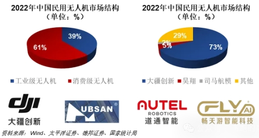 我国无人机行业参与者众多,市场竞争格局高度集中,消费领域龙头企业为大疆创新,市场总份额约为73%。
