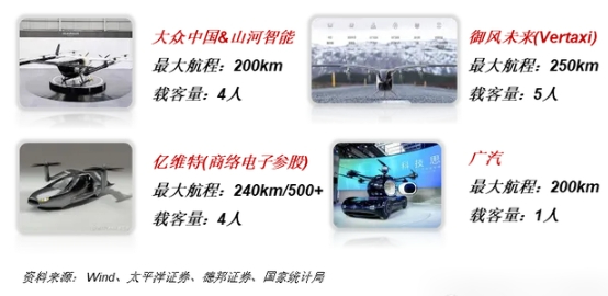 国内竞争格局:根据公司公告和华福证券整理结果,目前全国主要厂商的eVTOL最大航程突破500km,载客量可达到5人,最大起飞重量超过2200kg,具体情况如下: