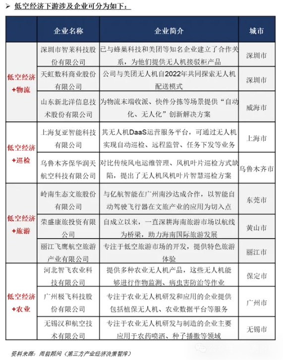 大力发展如:低空飞行产业包括通用、警用、海关等各类低空飞行活动,主要涵盖生产作业类、公共服务类、航空消费类等产业。例如,农林飞行、医疗救护、航空物流、空中游览等。