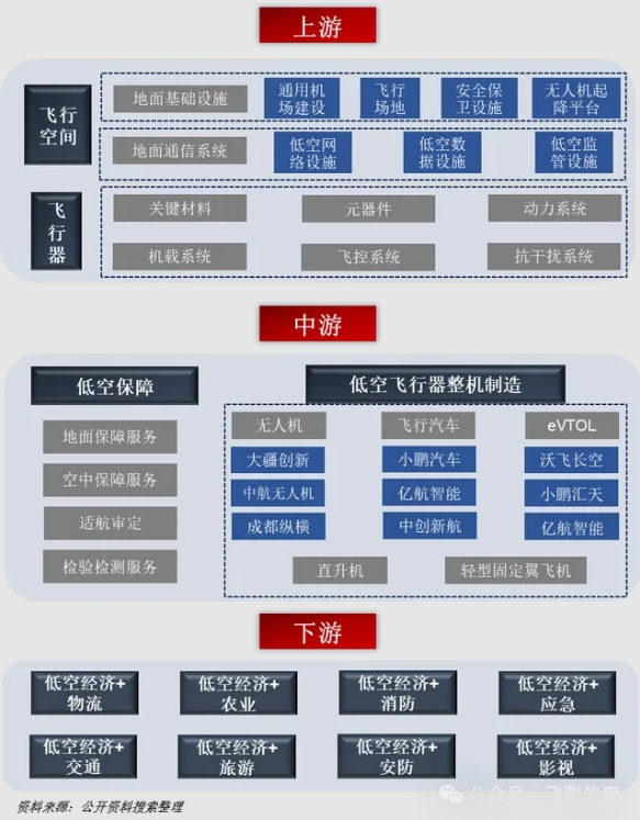 低空经济产业链主要由飞行空间和飞行器两条纵线贯通,因此产业链上游主要由低空新型基础设施及通信建设端、飞行器零部件及系统制造端构成,是整个产业链基础建设层,前者是飞行空间物理支撑,后者是飞行器基本构成。