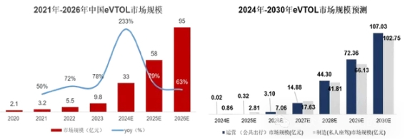 工信部下属赛迪研究院数据显示,2021年至2023年我国eVTOL产业规模由3.2亿元增长到9.8亿元;预计2024年eVTOL产业将迎来新一轮商业化爆发周期,产业规模将达到32亿元,2026年将达到95亿元。2021年-2026年复合增长率约为97%。