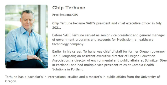 奇普·特胡恩,2021年7月成为SAIF公司的总裁兼首席执行官。在加入SAIF之前,特胡恩曾担任医疗技术公司Medicision的政府项目和账户高级副总裁兼总经理。在加入SAIF之前,特胡恩曾担任前俄勒冈州州长泰德·库隆戈斯基(Ted Kulongoski)的幕僚长;俄勒冈教育协会的助理执行主任;波特兰施尼策钢铁公司的环境与公共事务总监;以及Cambia Health Solutions公司的多个副总裁职位。特胡恩拥有俄勒冈大学国际研究学士学位和公共事务硕士学位。