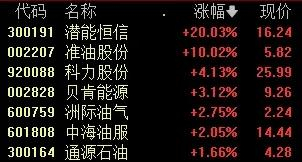 油气开采及服务板块今天位居同花顺A股概念板块涨幅榜第二,截至收盘,潜能恒信“20CM”涨停,准油股份涨停。其中,准油股份在东方财富股吧人气排名较昨日蹿升近4500位,位于人气飙升榜第一位。