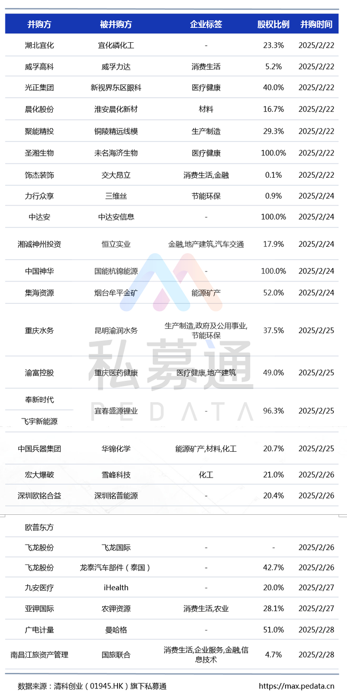 清科创业(01945.HK)旗下私募通统计:截至本周五下午,本周并购市场共发生24起并购事件,披露的交易金额为118.03亿人民币。本周涉及金额较大的并购事件是:2025年2月25日,奉新时代新能源材料有限公司、江西飞宇新能源科技有限公司对宜春盛源锂业有限责任公司进行增资,出资金额是26.00亿人民币。宜春盛源锂业有限责任公司是一家矿产勘探和开采服务商。本次的并购方江西飞宇新能源科技有限公司是一家在矿产勘探和开采方面拥有成熟的运营管理和技术团队的企业,通过本次交易,能助力宜春盛源锂业有限责任公司的业务有更好的发展。(2025年2月22日-2025年2月28日)