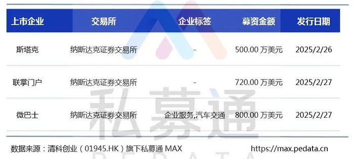 清科创业(01945.HK)旗下私募通MAX 统计:截至本周五下午,本周有3家企业上市,总融资金额1.43亿人民币。本周融资金额较大的上市事件为:2025年2月27日,微巴士国际在纳斯达克证券交易所成功挂牌上市。微巴士公开发行股票200.00万股,发行价格为4.00美元/股,总募集金额为800.00万美元。微巴士计划将此次募集资金用于在美国设立新的子公司或代表处、销售和营销、数字平台相关产品和服务的研发,以及一般公司和营运资金用途。微巴士国际是一款巴士实时运行信息查询平台,提供巴士查询、手机移动支付购票、巴士停车站点导航、以及巴士实时运行信息查看等功能,可以帮助用户提前查看并购买专线车票,并且电子乘车票避免了纸质车票容易丢失的问题,更加方便用户验票乘车。(2025年2月22日-2025年2月28日)
