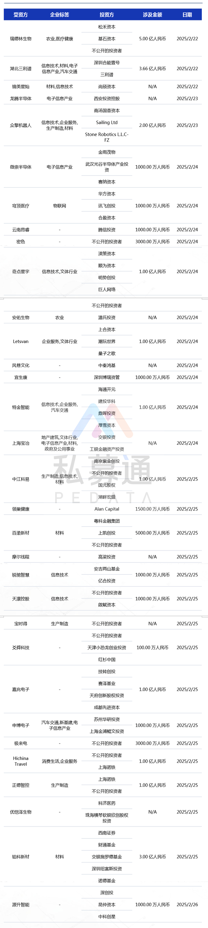 清科创业(01945.HK)旗下私募通统计:截至本周五下午,共发生57起投资事件,其中披露投资金额事件45起,共计38.86亿人民币。本周涉及金额较大的投资事件是:2025年2月22日,深圳市松禾资本管理有限公司、基石资产管理股份有限公司、不公开的投资者投资深圳瑞德林生物技术有限公司超5.00亿人民币。深圳瑞德林生物技术有限公司是一家合成生物技术研发应用服务商,是以合成生物技术为核心,以多学科交叉应用技术平台为依托,研发、生产功能性健康原料为主的高新技术企业。专注打造合成生物领域的创新产品和业务解决方案,致力于建设涵盖生物计算与人工智能、绿色化学、基因工程、酶工程、细胞工程、发酵工程、智能自动化、质量研究的“绿色生物智造平台”,促进合成生物学、化学、信息技术、工程学等尖端技术领域的融合创新。(2025年2月22日-2025年2月28日)
