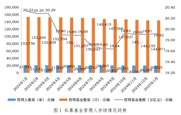 截至2025年1月末,存续私募基金管理人20,025家,管理基金数量144,071 只,管理基金规模19.92万亿元。其中,私募证券投资基金管理人7,904家;私募股权、创业投资基金管理人11,923家;私募资产配置类基金管理人6家;其他私募投资基金管理人192家。