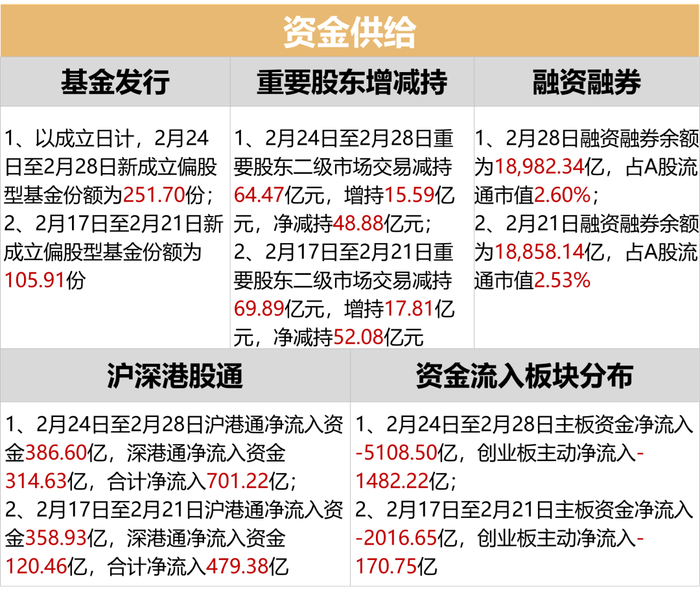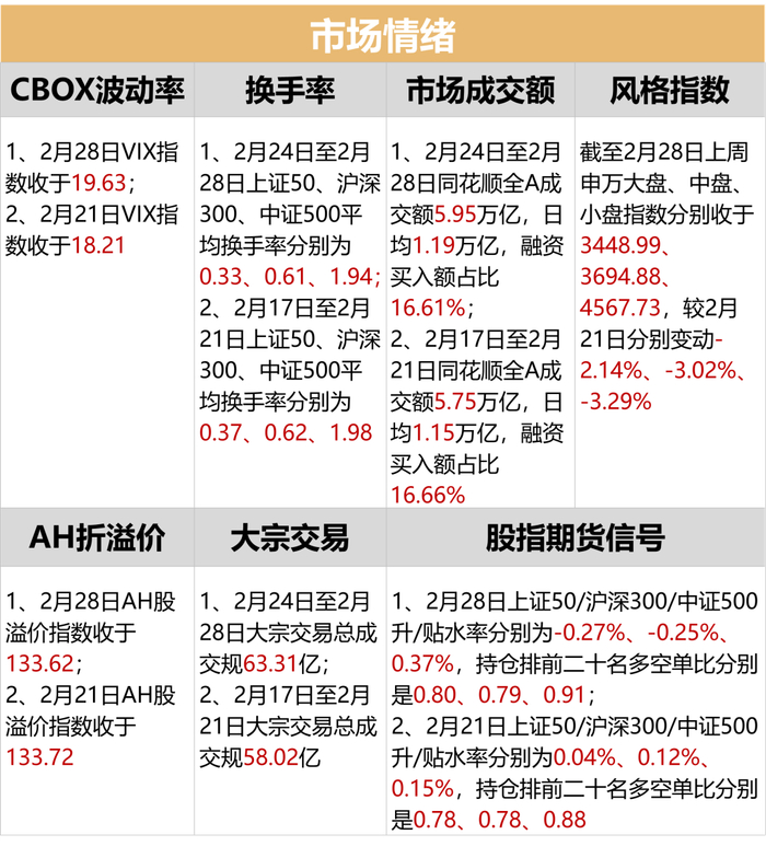 本交易周期(2/24-2/28)上证综指下行1.72%,深证成指下行3.46%,创业板指下行4.87%。两市成交9.79亿元,周度日均市场成交额为1.96万亿元,日均增长率为4.00%。上证综指换手率为1.20%,成交额3.81万亿元;深证成指换手率3.64%,成交额为5.98万亿元;创业板指换手率为5.82%,成交额2.90万亿元。