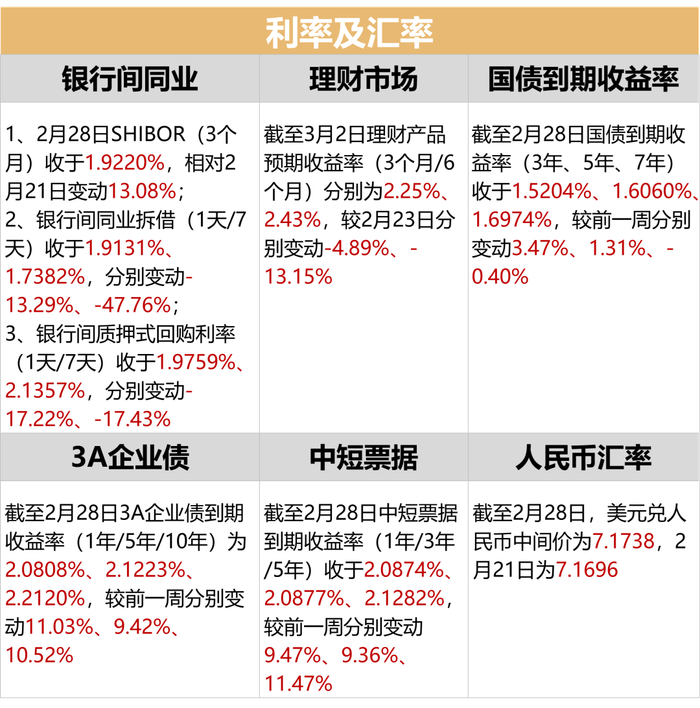 利率方面,本周(2/24-2/28)银行间同业利率整体呈现下行态势;国债收益率整体呈上行态势,企业债收益率呈上行态势。