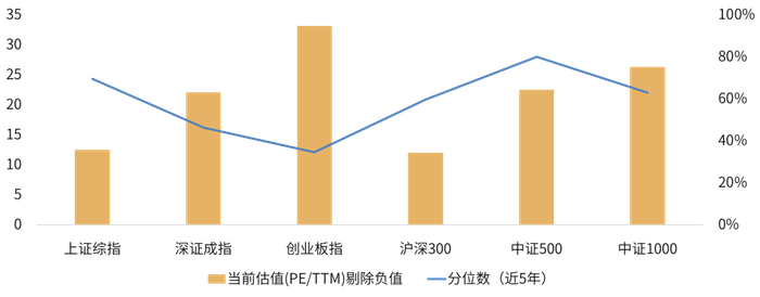 目前上证综指PE(TTM,剔除负值)下行至12.54倍,历史分位数下行至69.49%。深证成指PE(TTM,剔除负值)下行至22.09倍,历史分位数下行至46.30%。创业板指PE(TTM,剔除负值)下行至33.13倍,历史分位下行至34.54%。