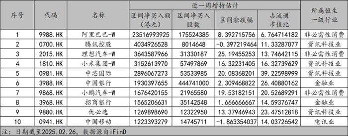 本周(2/24-2/28)沪港通净流入资金386.60亿,深港通净流入资金314.63亿,合计净流入701.22亿。截至2月26日,南向资金近一周个股增持净买入额前三分别为阿里巴巴-W、腾讯控股和理想汽车-W。
