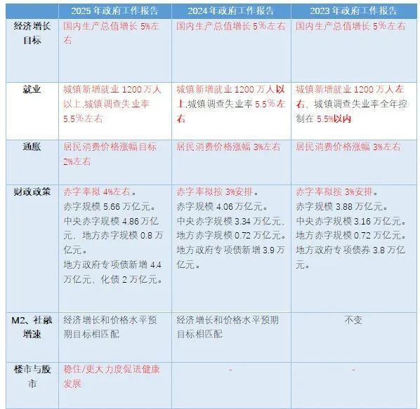 《报告》指出,2025年经济发展预期目标为国内生产总值增长5%左右。并且同时达到城镇新增就业1200万人以上,城镇调查失业率5.5%左右;居民消费价格涨幅2%左右。GDP目标、就业人数与失业率均与去年目标保持一致,CPI目标有所下调。