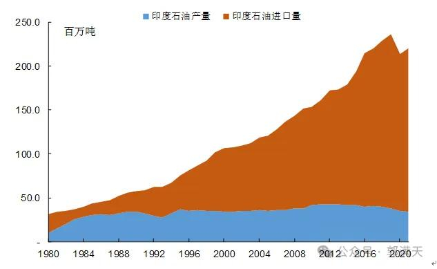 2020年,印度的石油产量只有3510万吨,这个产量水平仅是中国的17.6%;同期印度的石油消费量是2.2亿吨,因此印度需要进口1.85亿吨的石油。