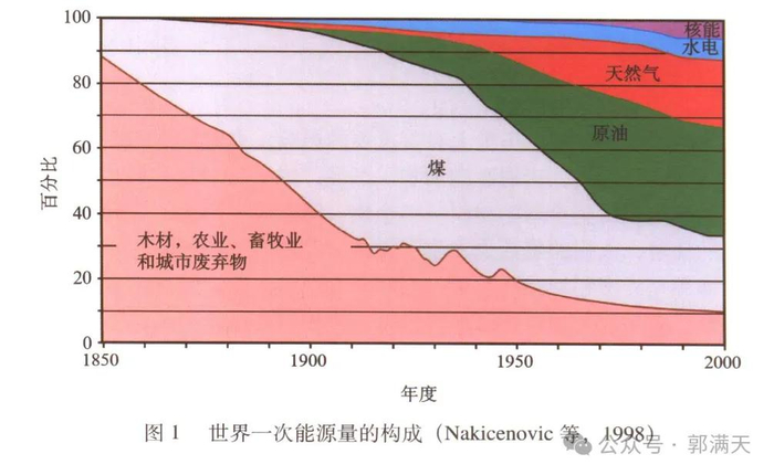 在工业革命发生之前,人类社会需要的能源主要是秸秆、木材、牛粪等农业社会的自然产物。第一次工业革命之后,随着煤炭、石油、天然气等资源的大规模开发利用,人类社会的生产力实现了飞跃。