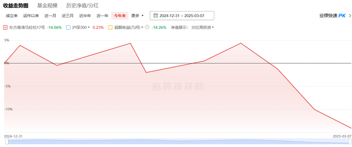 三方平台数据显示,去年收获百亿级私募冠军的东方港湾,今年前两个月业绩在百亿梯队中垫底,截至3月7日,旗下代表产品今年以来跌幅已超过14%。