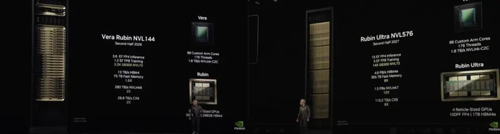 不过,黄仁勋也借这个场子预告了2026年上市的基于Rubin架构的下一代GPU以及更强的机柜Vera Rubin NVL144——72颗Vera CPU+144颗 Rubin GPU,采用288GB显存的HBM4芯片,显存带宽13TB/s,搭配第六代NVLink和CX9网卡。
