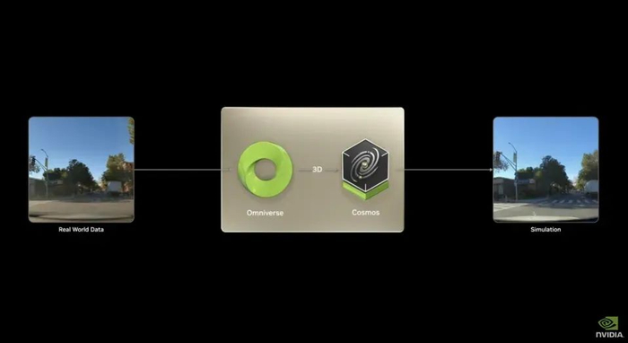 整个模型包含三部分能力,第一部分Cosmos Transfer 将结构化的视频文字输入转换为可控的真实感视频输出,凭空用文字产生大规模合成数据。这解决了当前具身智能最大的瓶颈——数据不足问题。而且这种生成是一种“可控”生成,这意味着用户可以指定特定参数(如天气条件、物体属性等),模型会相应调整生成结果,使数据生成过程更加可控和有针对性。整个流程还可以由Ominiverse和Cosmos结合。