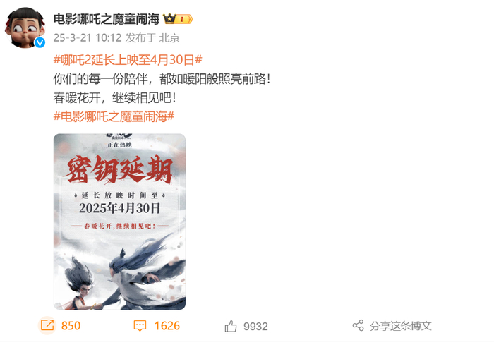 3月21日上午,《哪吒2》官方宣布密钥延期,将再次延期上映一个月至4月30日。