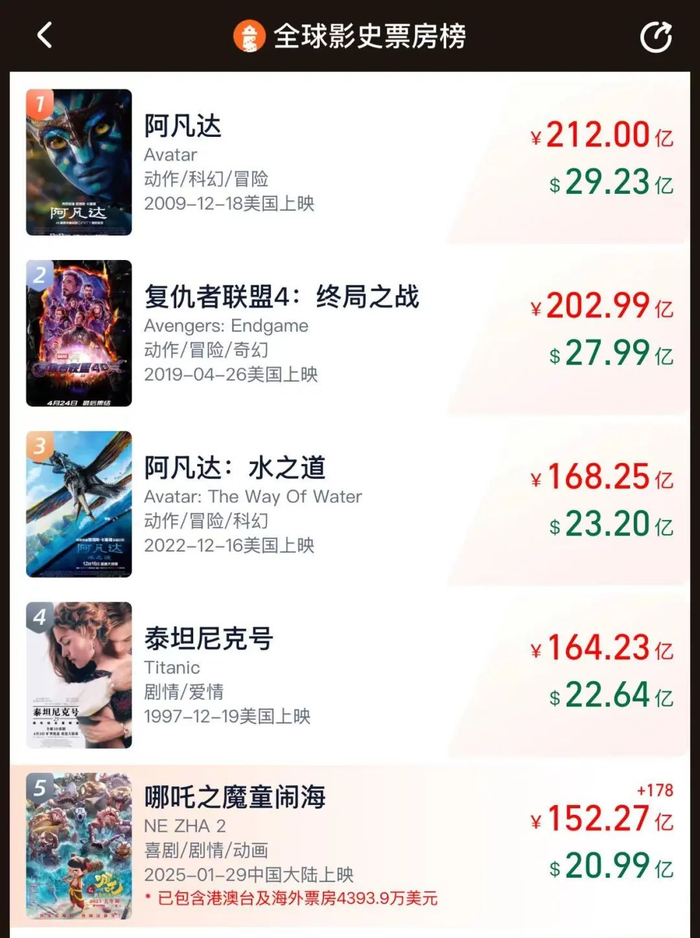冲进全球电影票房榜前5后,《哪吒之魔童闹海》(以下简称“《哪吒2》”)的票房还在持续上涨。
