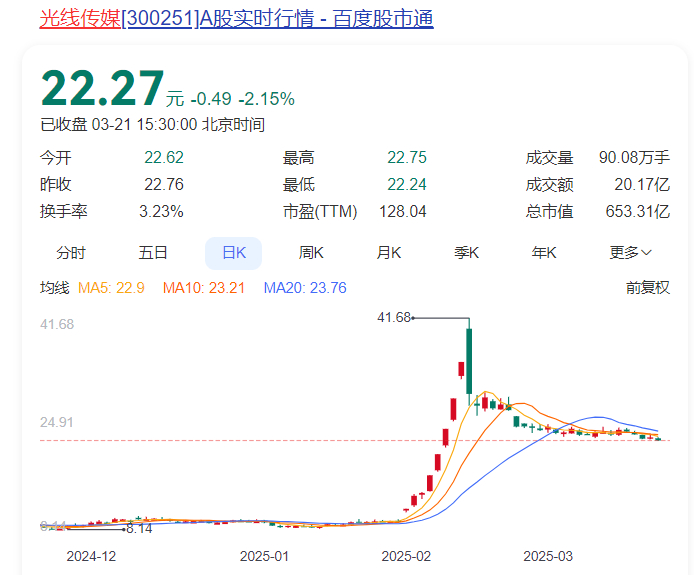 截至3月21日收盘,光线传媒再跌近2%,股价报收22.27元,仅20多个交易日就跌去了超40%,不过较《哪吒2》上映前仍涨超100%。