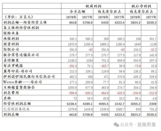 下表显示了每个主要经营类别下的税前利润(其中一些业务因存在大量免税利息和股息收入因此实际税率较低),以及伯克希尔在税前和税后收入中所占的份额。 任何业务所产生的重大资本损益均未在经营性利润数字中展示,而是汇总在表格底部的“已实现证券收益”行中。由于会计和税务方面的复杂性,表格中的数字不应被视为绝对准确的数字,而应被视为我们旗下业务在1977年和1978年中利润贡献的近似值。
