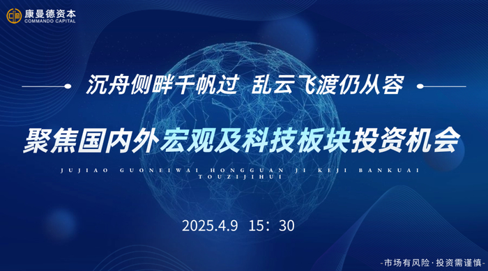 2025年4月9日,康曼德资本通过线上视频直播方式举办了2025年春季行研对话,主题为“沉舟侧畔千帆过,乱云飞渡仍从容”。公司联席研究总监李俊松和科技行业研究员陈庆平联袂出席,对于当前中美宏观经济现状、贸易战的影响以及新形式下的科技板块投资策略做了深度解析。>>视频直播