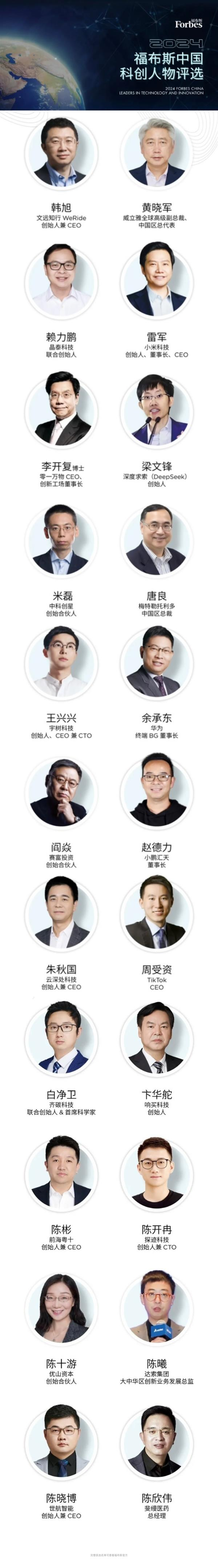 4 月 9 日, 福布斯中国发布「2024 福布斯中国科创人物」榜单, 有多位世界 500 强和中国领军企业的领导人身影, 所有入选者都是企业创始人及核心高管。他们拥有融合科创生态、改变未来产业格局的能力, 将引领不同细分赛道的发展。