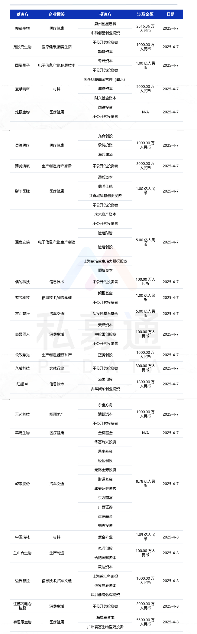 清科创业(01945.HK)旗下私募通统计:截至本周五下午,共发生44起投资事件,其中披露投资金额事件37起,共计44.23亿人民币。本周涉及金额较大的投资事件是:2025年4月7日,诺德基金管理有限公司、财通基金管理有限公司、高爱珍、易米基金管理有限公司、广发证券股份有限公司等投资江苏嵘泰工业股份有限公司8.78亿人民币。江苏嵘泰工业股份有限公司创建于2000年6月,注册资本12000万元人民币,是集模具研发与制造、铝合金压铸、精密加工于一体的高新技术企业,核心产品为汽车转向系统、传动系统、发动机系统精密压铸件。司引进德国、日本、意大利、美国等国际先进的压铸、加工、检测设备,现有350T至2700T压铸机40多台,3轴至5轴数控加工中心200多套,配置了完备的后处理生产线和光谱仪、在线X光无损探伤机、蔡司三坐标测量仪、盐雾试验机等高端进口检测设备。产品主要供应博世、博世华域、采埃孚、威伯科、蒂森克虏伯、捷成唯科等国际知名汽车部件总成企业,最终用户包括上海大众、一汽大众、一汽奥迪、奔驰、宝马、沃尔沃等汽车企业。(2025年4月4日-2025年4月11日)