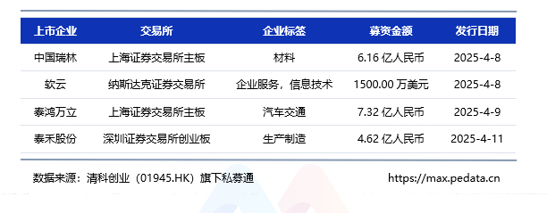 清科创业(01945.HK)旗下私募通统计:截至本周五下午,本周有4家企业上市,总融资金额19.16亿人民币。本周融资金额较大的上市事件为:2025年4月8日,软云在纳斯达克证券交易所成功挂牌上市。软云公开发行股票375万股,发行价格为4.00美元/股,总募集金额为1500万美元。软云科技有限公司于2021年3月11日在开曼群岛注册成立。软云成立于2012年,是专注于人工智能算法、新型智慧题库建设、学习行为大数据测评和教育行业应用整体解决方案的国家级高新技术企业,公司秉承“大数据改变教育”的理念,专注教育领域,已成为国内一流的以测评为核心的教育大数据人工智能服务提供商。软云利用信息化技术深入学生学习全流程采集数据,将海量数据基于人工智能技术进行输出与应用,帮助孩子描绘最精准的学情肖像,为现代化教育实现增效减负,让每一位孩子都可以闪闪发光。(2025年4月4日-2025年4月11日)