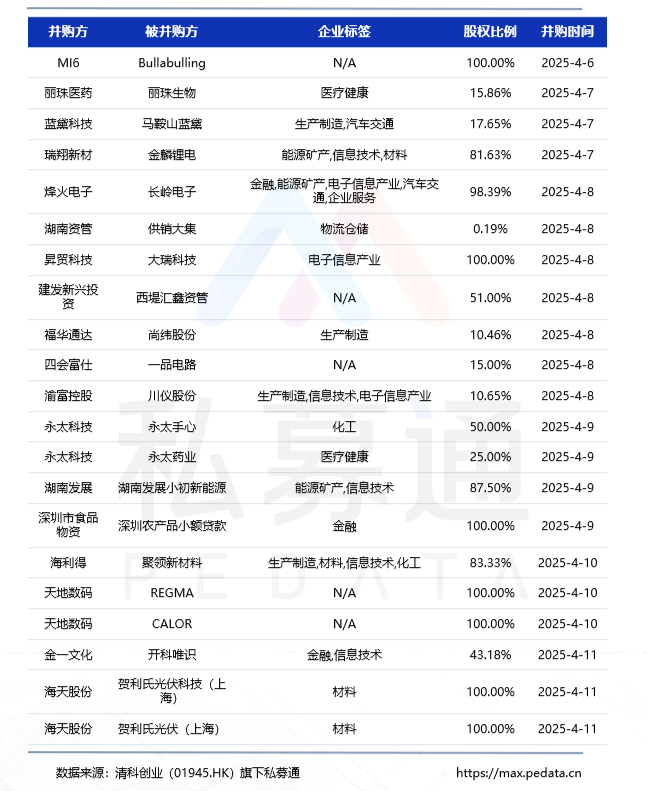 清科创业(01945.HK)旗下私募通统计:截至本周五下午,本周并购市场共发生21起并购事件,披露的交易金额为46.54亿人民币。本周涉及金额较大的并购事件是:2025年4月8日,陕西烽火电子股份有限公司成功受让陕西长岭电气有限责任公司、陕西金创和信投资有限公司、陕西电子信息集团有限公司持有的陕西长岭电子科技有限责任公司的98.39%的股权,作价11.47亿人民币。长岭电子是一家雷达导航设备生产商,是由国营长岭机器厂主辅分离改制而成的以雷达导航为专业的的高科技企业。公司拥有六大系列雷达电子装备,从事军民两用电子产品、民用电子产品。公司拥有先进的电子产品装配、调试、试制生产线和加工制造能力、齐全的环境试验及精密检测设备,形成了涵盖生产、加工、检测、试验等门类齐全、配套完整的工艺手段。(2025年4月4日-2025年4月11日)