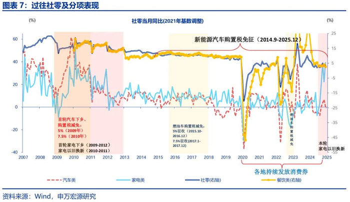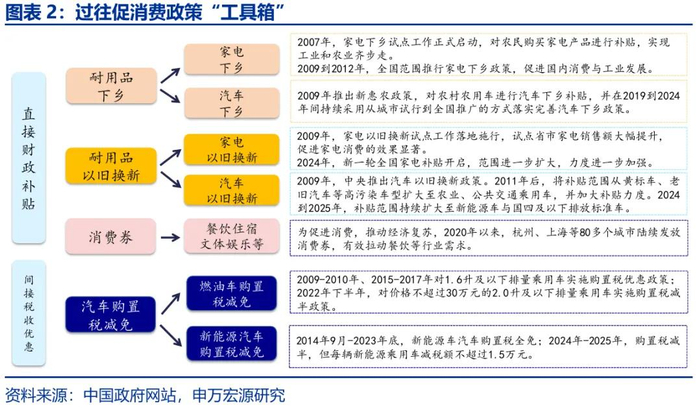 稳增长压力较大、出口承压时期,扩内需、促消费通常成为政策重要着力点之一。回顾我国曾使用过的促消费政策“工具箱”,或可分为直接财政补贴,例如下乡补贴、以旧换新补贴、消费券等,和间接优惠支持政策,典型如汽车购置税减免、假期高速公路通行费减免等。2007-2012年期间,我国曾推行家电和汽车摩托车下乡和以旧换新等政策;2014-2017年和2022年下半年,政策通过部分汽车购置税优惠政策,促进燃油车消费,而2018年以来新能源汽车购置税减免政策持续也推动我国新能源汽车产业快速发展。