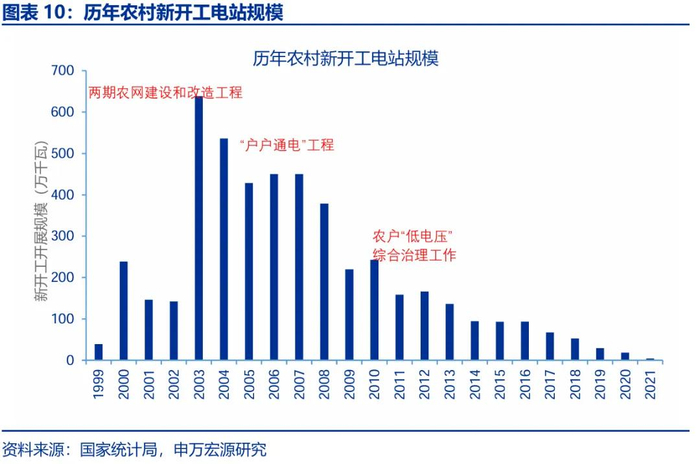 1998年,为应对亚洲金融危机,我国加大对农村基础设施项目在内的基建项目资金支持力度,连续5年发行长期建设国债支持。1998年到2004年,两期农网建设和改造工程历时6年,国家共投入2100多亿元,架设低压电线344万公里。2006年,建设社会主义新农村背景下,国家电网公司、南方电网公司推行了以大电网延伸为主的“户户通电”和无电户通电工程,截至2008年底,国家电网和南方电网分别解决416万、16.6万无电人口的通电问题,为后续家电下乡政策全国推行奠定电力设施基础。