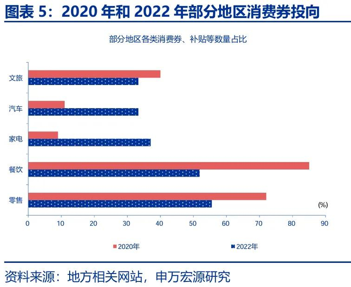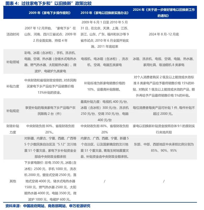 全国提振消费补贴力度更大、重点针对大宗消费,地方促消费以消费券为主、支持领域更多元。从过往下乡和以旧换新政策来看,全国层面促消费多重点支持汽车和家电等商品消费的“大头”,且家电、汽车摩托下乡政策主要以农村耐用品的“普及”带动消费增长,以旧换新政策则以促进居民家电及汽车“升级”需求来稳住商品消费基本面。相比促消费,地方促消费方式,参与主体及支持领域更为多元化,部分地区消费券资金来源不仅包含地方财政,亦有商家平台和金融机构参与,且对家电、汽车等商品消费和食宿文旅等服务消费均有支持。