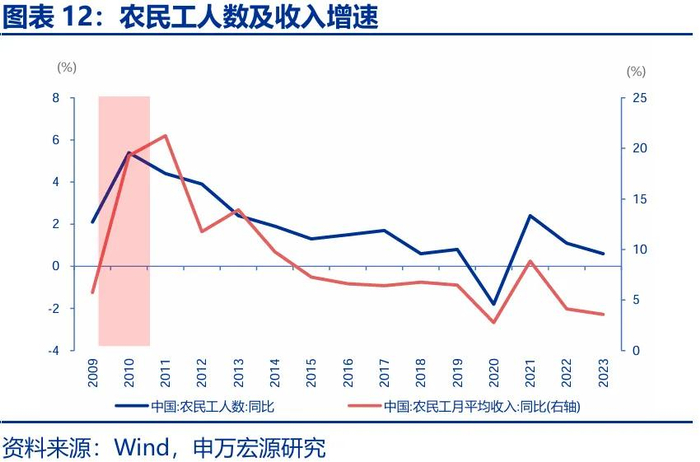 2005年12月29日,第十届全国人大常委会第十九次会议决定,2006年1月1日起废止农业税条例。农村税费改革有效降农民负担,据统计,2006年全面取消农业税后,与改革前的1999年相比,全国农民一年减轻负担约1250亿元,人均减负约140元。“减负”之外,2008年底开启的“四万亿”稳增长计划亦为农民工群体带来“增收”,2009-2011年期间农民工人数、农民工人均收入增速大幅提升,进一步从收入端提升农村居民消费能力。
