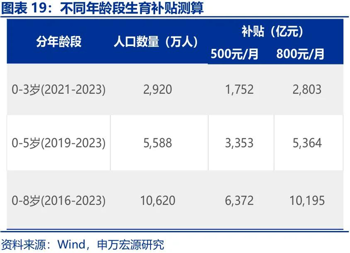 从中长期来看,改善收入分配机制、加强社会保障等机制性政策或在中长期发挥更大作用。根据当前养老金领取人员测算,若适当提高退休人员基本养老金,假设每位退休人员每月收入增加500元,则全年城镇职工基本养老保险或多支出8700多亿元;适当提高城乡居民基础养老金,假设每月增加200元,则全年城乡居民养老保险或多支出约4200亿元;育儿补贴方面,静态视角来看,若对0-5岁幼儿每月补贴800元,全年财政或需多支出近5400亿元。