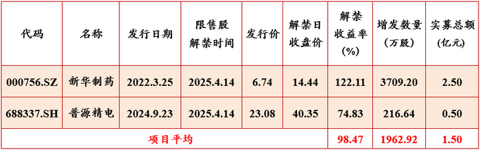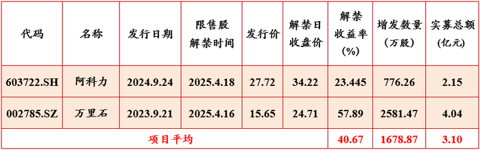 本周共有4家上市公司的定向增发项目到期解禁。其中2家公司的定向增发项目按竞价发行,竞价项目解禁平均收益率为40.67%;2家公司的定向增发项目按定价发行,定价项目解禁平均收益率为98.47%。