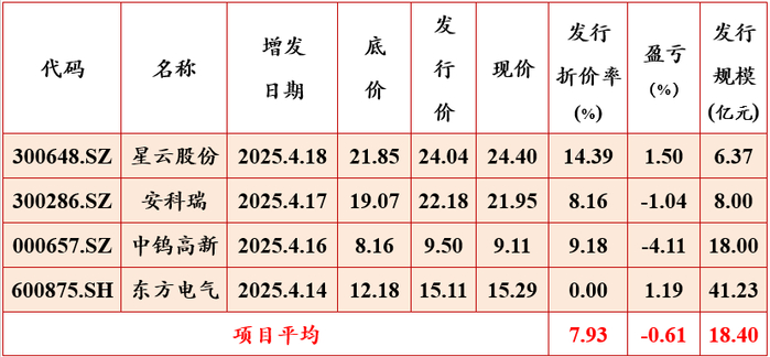 本周共有4家上市公司公告其定向增发项目结果,4家公司的定向增发项目都按竞价发行,平均浮盈为-0.61%。