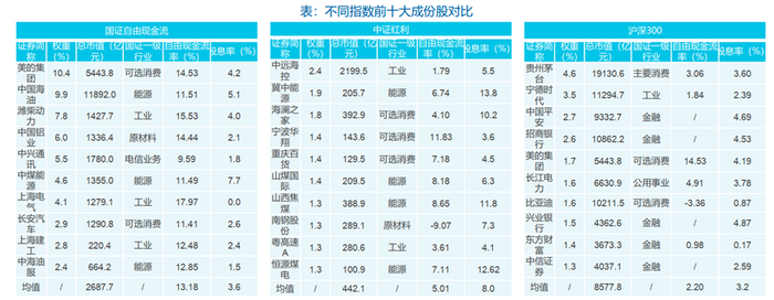 从成分股来看,国证自由现金流指数高度覆盖“现金牛”公司,CR10合计超56%,市值介于中证红利与沪深300之间,股息率与沪深300的前十大成分股相似。