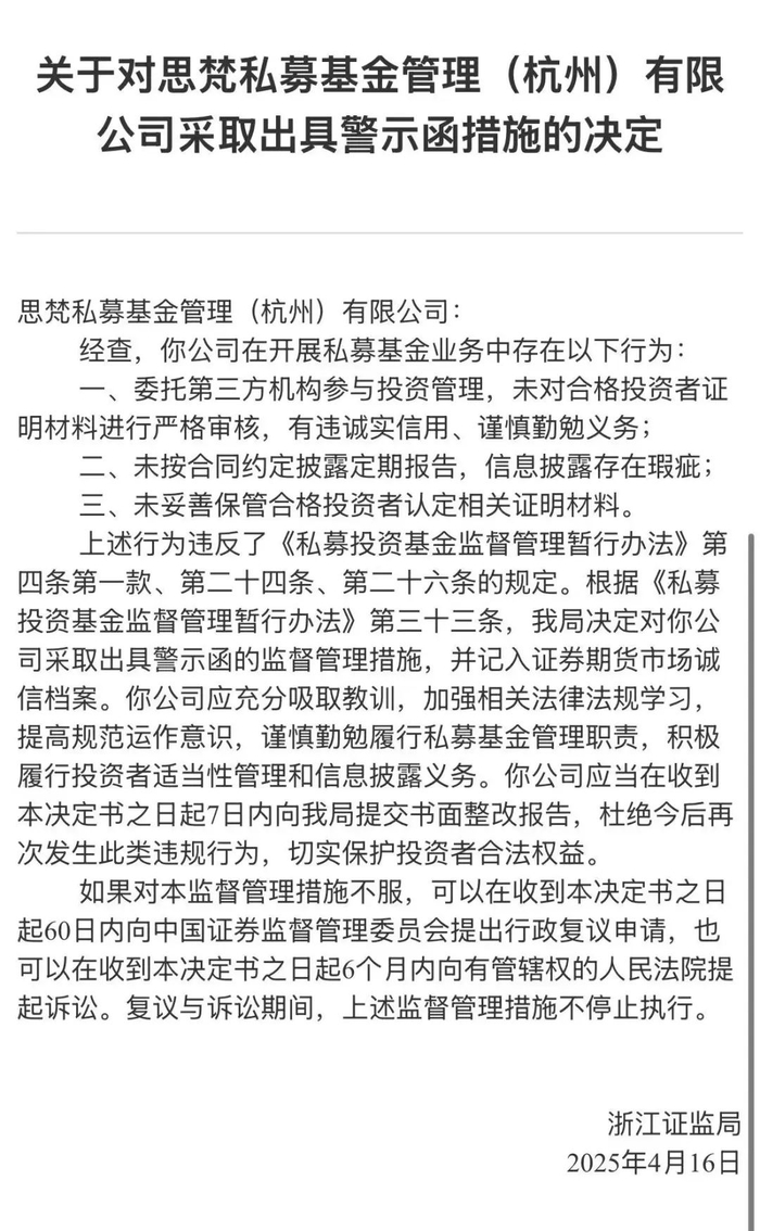 近期,上海、山东等多地证监局相继启动2025年度私募基金专项检查,重点覆盖募集环节合规、信息披露、投资者适当性管理等核心领域。与此同时,思梵私募基金管理(杭州)有限公司因委托第三方机构失职、信披违规等问题被警示,再次为行业敲响警钟。结合2025年监管政策升级与检查动态,私募机构需以案为鉴,系统化构建合规防线。