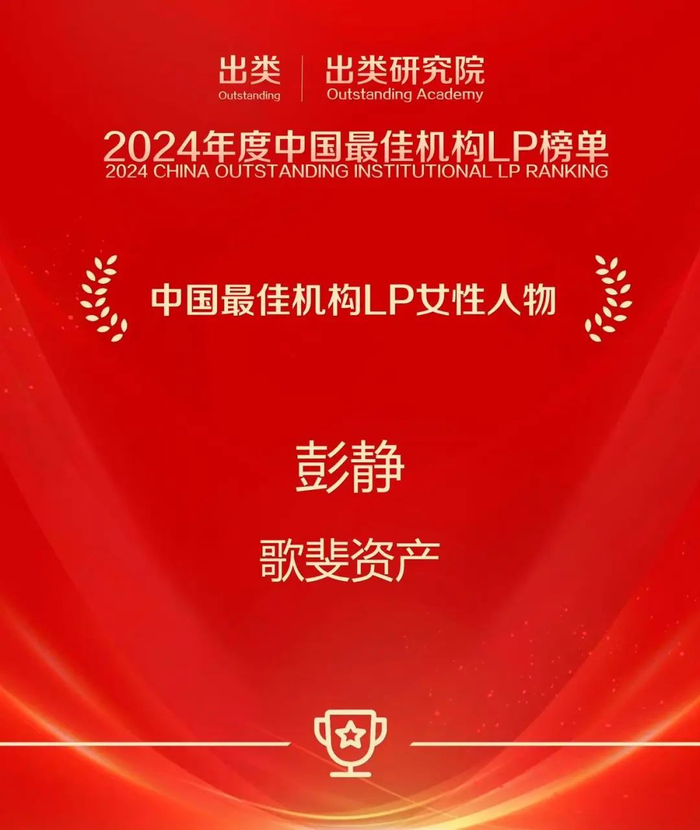 歌斐资产深耕国内股权投资市场十余年,凭借优异表现拿下“2024年度中国最佳机构LP TOP20”奖项,歌斐资产CEO 彭静女士获得“2024年度中国最佳机构LP女性人物”荣誉称号。