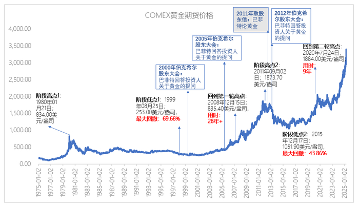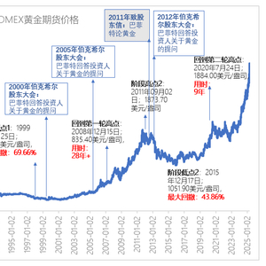 此后,COMEX黄金价格开始了持续9年的下跌盘整周期,期间最大回撤43.86%9年后收复2011年高点。近几年,又开启第三轮上涨周期。