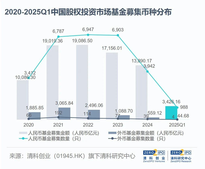 外币基金募资活动持续低迷。2025年第一季度仅有4只可投向中国大陆的外币基金完成新一轮募集,同比下降71.4%,募资规模约合44.68亿元人民币,同比下降77.9%;新募外币基金主要是双币机构旗下外币基金、QFLP基金。