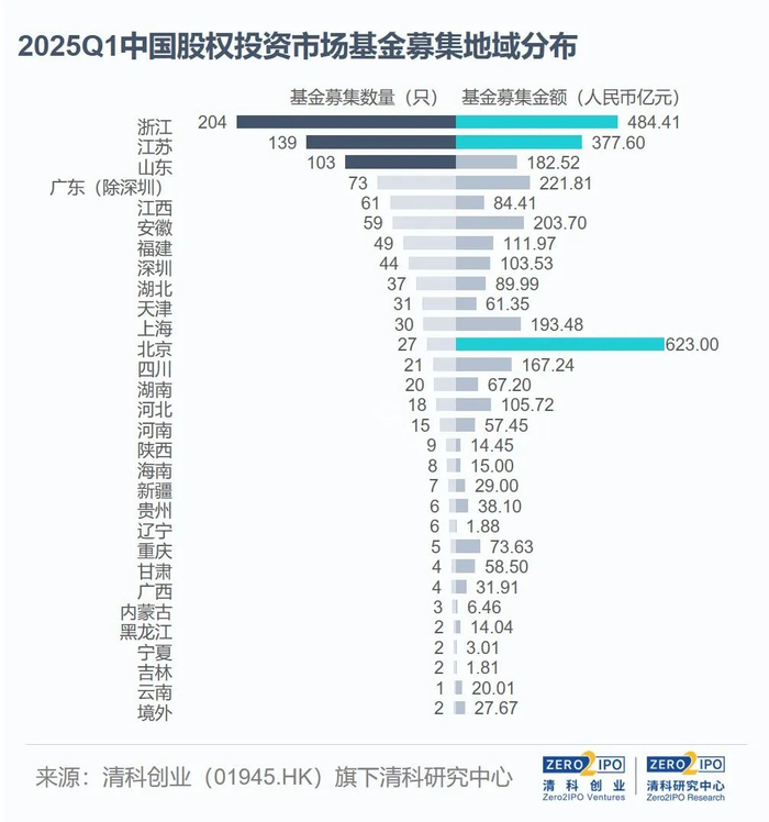 2025年第一季度,浙江、江苏、山东新募集基金数量领先。其中,浙江以204只居于首位,同比小幅下降1.4%,省内嘉兴、杭州、宁波、湖州、温州五地位列城市募资活跃度排名前25。江苏以139只次之,同比下降2.9%,主要由苏州、扬州、无锡及南京四地贡献。山东以103只位列第三,同比下滑22.0%,多数集中在青岛地区。募资规模方面,本季度北京新募基金规模居于首位,共有623.00亿元人民币,同比增加6.2%;其中,10只规模在10亿元及以上的基金合计募得597.86亿元人民币,高于2024年同期表现。