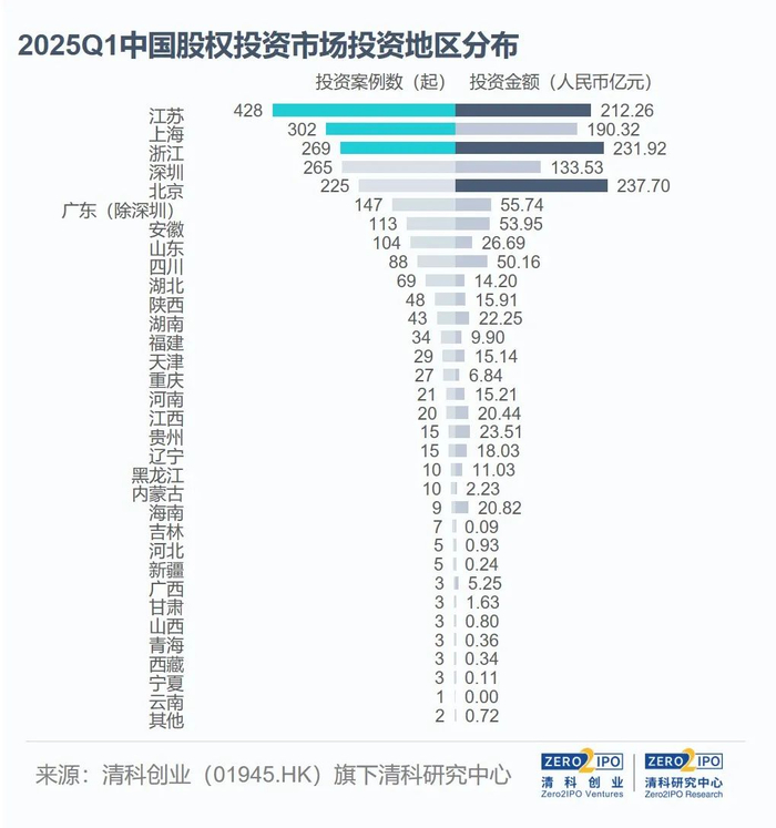 2025年第一季度,江苏、上海、浙江、深圳和北京五地的案例数和投资金额集中度居高。江苏(428起,同比+5.7%;212.26亿元,同比+16.9%)案例数居于首位,半导体及电子设备、生物技术/医疗健康、机械制造等多个行业投融资保持活跃。上海(302起,+21.8%;190.32亿元,-45.4%)投资活跃度次之,但本季度的大额案例较为稀缺,投资金额排名降至第四位。浙江(269起,+12.6%;231.92亿元,+84.7%)案例数位列全国第三,投资金额增幅显著,由去年同期的第六位提高至第二位。深圳和北京的投资案例数均在200起以上,其中深圳投资案例数和金额同比分别增长6.0%、6.1%,北京的投资金额达到237.70亿元人民币,位列全国首位,完成大额融资的企业包括北电集成、智谱AI等。